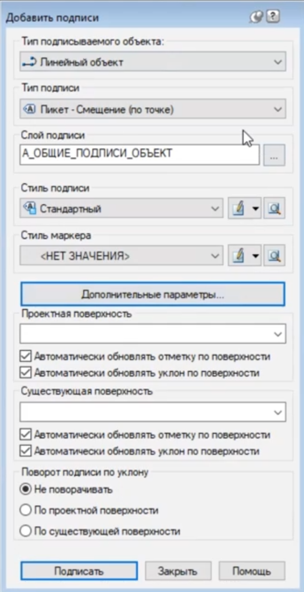 •фиксированный XY - фиксирована к конкретной координате: при изменении положения трассы подпись останется на месте, но ее содержимое обновится. При ее задании указывается не пикет-смещение, а координата на местности;