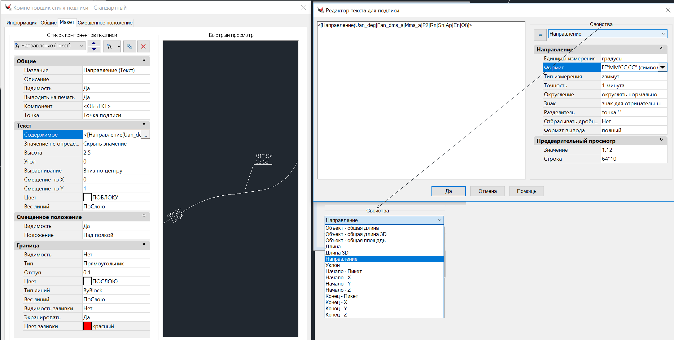 Стили подписи и предлагаемые свойства: